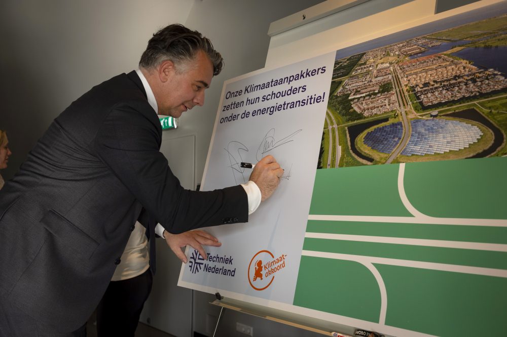 Voorzitter Doekle Terpstra van Techniek Nederland tekent vandaag in Madurodam voor steun aan het Klimaatakkoord. Eric Wiebes, minister van Economische Zaken en Klimaat en Ed Nijpels, voorzitter van het Klimaatberaad, zijn daarbij aanwezig. De installatiebranche wil zich inzetten om de CO2-uitstoot van de gebouwde omgeving, de infrastructuur en de industrie terug te dringen.