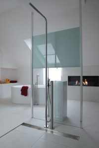 Grote tegels zijn niet meer weg te denken uit de doucheruimte. Maar, de uitdaging bij deze tegels is een juist ontwerp van de afwatering. Niet alleen vanuit esthetisch oogpunt, maar ook technisch moet de gekozen oplossing namelijk passen bij de toegepaste tegel en het mogelijke vloerafschot in de badkamer. Met name bij een groter formaat tegel of natuursteen is een douchegoot de ultieme oplossing. Hierbij hoeft het geadviseerde afschot van 2% namelijk slechts in één richting gemaakt te worden.