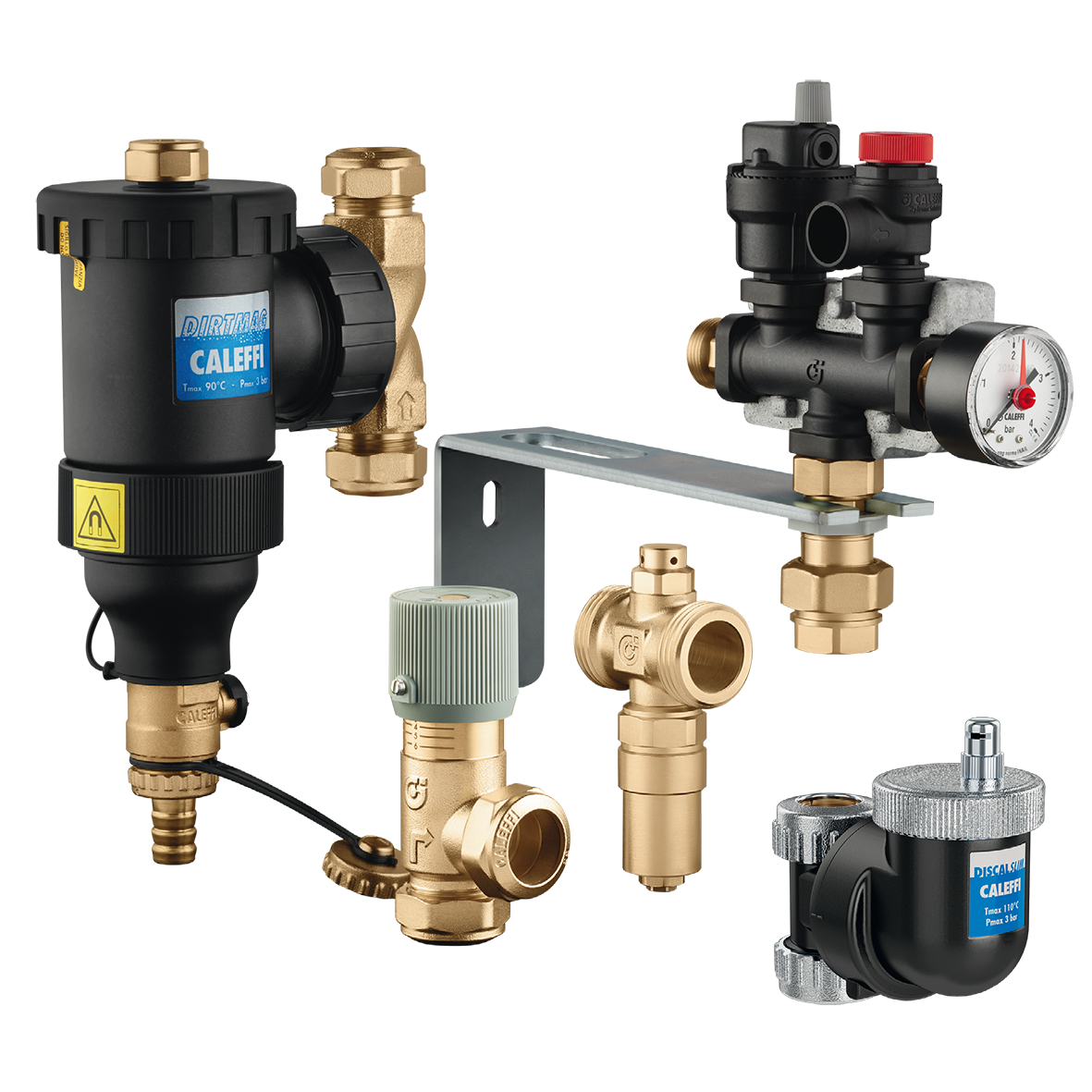 De volgende onderdelen zijn te vinden in de warmtepompsets van Caleffi: