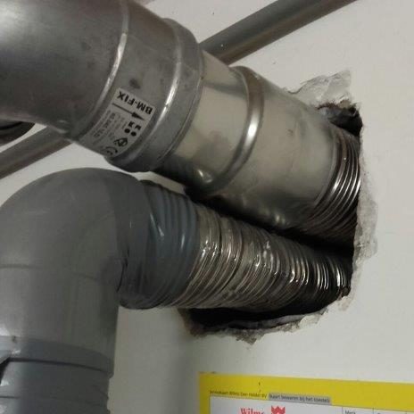 Voor Karel zat er niets anders op dan zijn boorhamer uit het stof te halen om een gat te forceren op de plaats waar de rookgasfvoer moest komen. Nadat hij ruim een half uur in een ongemakkelijke houding met het heftig kloppende machine in zijn handen stof had lopen happen – en hij er zelf eigenlijk al de brui aan wilde geven – deed het apparaat dit voor hem: ‘plof’ hoorde hij en zijn boorhamer was overleden.