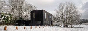 Het duurzame huis is van architect Joris Verhoeven. Hij ontwierp zijn compacte, geprefabriceerde houten boshut op zo’n manier dat de woning harmonieus opgaat in de omgeving. De ruwe zwarte gevels vallen nauwelijks op naast de omringende boomstammen en de strategisch geplaatste ramen bieden het hele jaar door uitzichten op het steeds veranderende landschap.