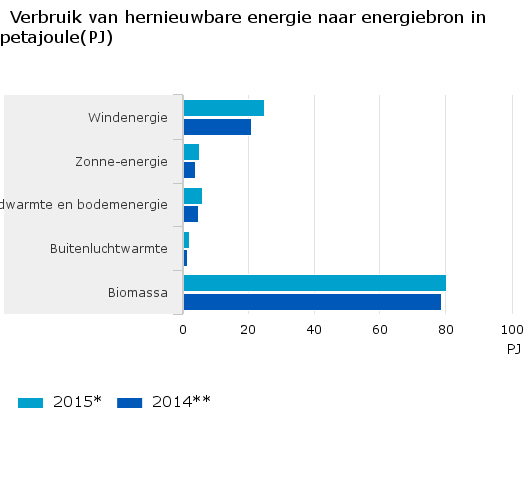 Biomassa is met bijna 70 procent van het totaal verreweg de grootste bron van hernieuwbare energie. Het energiegebruik uit deze bron is met 2 procent toegenomen, terwijl het energiegebruik uit zon, wind en aarde gemiddeld met 21 procent is gestegen. Het totale finale energiegebruik in Nederland is vergeleken met 2014 gestegen met bijna 2 procent. Ook hierdoor valt de groei van het aandeel hernieuwbare energie lager uit.