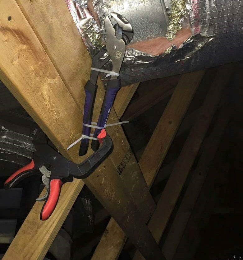 Karel werd teruggeroepen door een klant waar hij een paar weken geleden wat ventilatiekanalen had aangelegd. De klant had het idee dat er geen aanvoer zat naar één van de ruimtes (niet de garage gelukkig). Uitstekend uitzoekwerk van Karel (zoals we natuurlijk kunnen verwachten van deze top-installateur) bracht hem bij een lamme klep in één van de kanalen op zolder. Maar juist dat kanaal was vrij lastig te installeren geweest, vanwege de nogal irritante locatie. Hij stond dus niet te springen om de klep te vervangen. Gelukkig had Karel zijn gereedschapskoffer mee naar zolder genomen en de nodige ti-wraps bij zich. Dan maar een stuk gereedschap opofferen, moet hij gedacht hebben, die zou hij wel weer in rekening brengen. Dit valt tenslotte onder regiewerk. Het was niet zijn schuld dat die klep niet meer functioneerde (of waarschijnlijk nooit heeft gedaan).