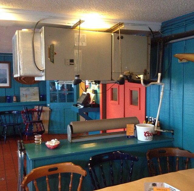 Hij bestelde een flinke unit en begin deze week begon hij aan zijn klus. Het systeem van ongeveer een meter of 2 lang kon hij maar net in zijn bus kwijt. Het uitladen kostte hem, vanwege omvang en gewicht, zo’n beetje zijn rug. Eenmaal in het restaurant kwam hij erachter dat er helemaal geen ruimte was in het plafond om een dergelijk bakbeest te monteren. Dat betekende dus dat hij dat zware rotding weer in zijn bus moest slepen, een ander systeem moest bestellen en de klant met zijn drijvende eters moest laten wachten totdat hij weer tijd had voor deze toch wel aardige klus. Dat nooit, dacht Karel, en zie met welke fantastische oplossing hij op de proppen kwam.
