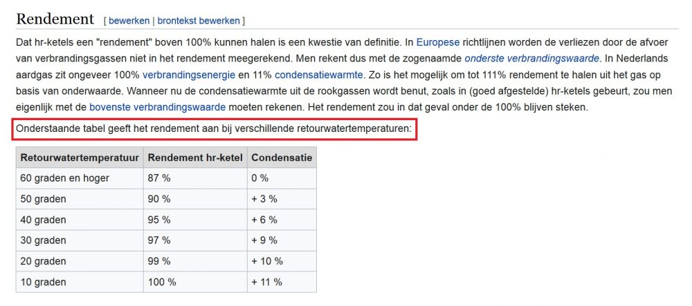 Deze afbeelding van het rendement van een cv-ketel laat zien waarom de verlaging van de aanvoertemperatuur belangrijk is.