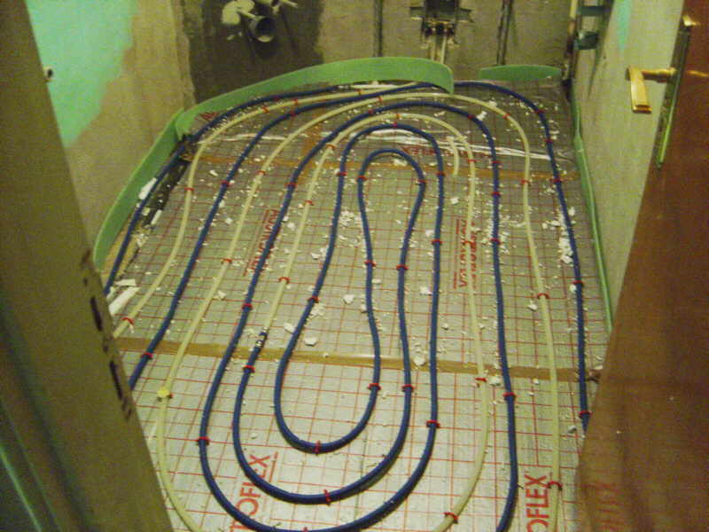 Gelukkig vond Karel in de chaos van zijn bus nog mooi een rolletje flexibele buis. Weliswaar bedoeld voor het trekken van elektradraad, maar prima toe te passen in een vloerverwarmingssysteem, zo vond hij. Mocht het wat gaan lekken dan was dit natuurlijk geen enkel probleem. We hebben het hier tenslotte wel over de natte ruimte.