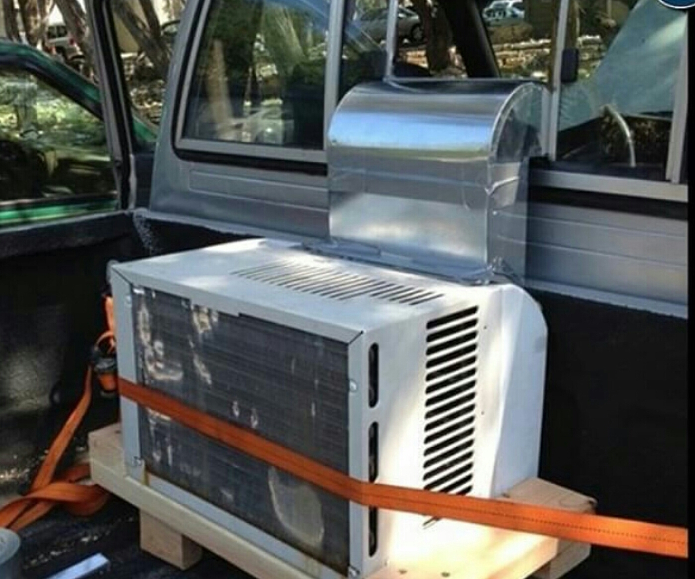 IMG_20160411_182331-1Vorige week nog gezien hoe Karel zijn ‘kantoor’ onderweg had ingericht en hij zijn geliefde lengtes pvc vervoerde? Ook deze week is zijn bedrijfswagen het onderwerp van gesprek. Met het mooie weer op komst zag Karel zichzelf al weer helemaal zwetend in zijn auto zitten, waarin jammer genoeg een airco ontbreekt. Noodgedwongen maakt hij nu nog vooral gebruik van zijn ‘Alle Ramen Kunnen Open’ systeem. Dat moest toch anders kunnen. Hij had laatst ergens een best wel goed werkend splitje vervangen. Die stond nog in zijn garage om ooit eens naar de oud-ijzerboer te brengen. Zoals de rest van het complete kerkhof aan HVAC-apparatuur dat inmiddels 3 hoog opgestapeld ligt in zijn garage en rond zijn huis. Maar goed, met het oog op de klimaatverandering en de hiermee gepaard gaande toenemende temperaturen, sleepte hij de splitunit onder een stapel oude warmtewisselaars en geisertjes vandaan, direct vanuit zijn garage naar zijn auto toe. Die split was snel aangesloten op de accu en met nog een strak kanaaltje naar binnen via de achterruit, was Karel klaar voor de aankomende zomerhitte. Alleen nog wat verzinnen op de kou in zijn nek.