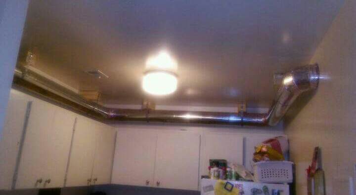 FB_IMG_1461972959977-1Het spaghetti-aircomonster van vorige week was voor Karel een opmaat naar een ander culinair huzarenstukje van zijn hand. Deze week stond een WTW- renovatie met kanaalwerk op de planning. Karel had al snel in de smiezen dat de garage naast de keuken slecht geventileerd werd. En aangezien hij nou eenmaal een Pietje precies is in zijn werk, ging hij direct aan de slag om deze kamer van de nodige frisse lucht te voorzien. Maar om de ventilatiebuis recht over de keuken te laten lopen vond zelfs Karel net even te ver gaan. Vooral ook omdat hij niet wist waar de elektriciteitsleiding van de plafondlamp liep en hij niet echt veel zin had om zichzelf onder spanning te zetten terwijl hij de buis in het plafond verankerde. Dat verankeren doe je normaal gezien natuurlijk keurig met een partijtje beugels, draadeind en schroeven. Hoewel hij deze keer de afwerking best wel netjes heeft gedaan. Blijft het natuurlijk jammer dat er door de keuken nu een buis met een doorsnede van 25 cm loopt, inclusief in het plafond geboorde stukken hout. Maar de garage was in ieder geval weer helemaal fris en fruitig, in hoeverre dat nou écht nodig was.