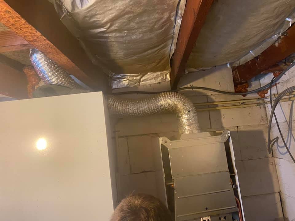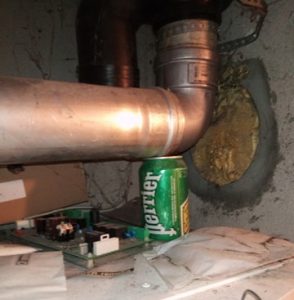 Fanatiek als altijd ging hij aan de slag. Het ging allemaal lekker voortvarend, totdat hij aan de rookgasafvoer wilde beginnen. In de puinhoop van zijn rijdend magazijntje kon hij geen enkele afvoer meer vinden, laat staan eentje voor rookgas. Hij haalde alles overhoop, maar niets…of toch? Die ventilatieslang kwam nu eigenlijk uitstekend van pas. Of er nou rookgas of lucht door zo’n slang gaat, zoveel maakt dat toch ook niet uit.
