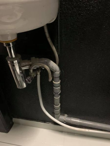 Zijn perfect bedoelde bocht bleek echter niet helemaal goed uit de verf te komen, zag hij zelf ook wel, waarop Karel besloot de aandacht van die rommelige waterleiding wat af te leiden. Hij besloot de afvoer uit meerdere delen samen te stellen, wat samen dan weer een mooi geheel zou opleveren. Een scheef gemonteerde sifon, zorgde voor de kers op de taart. Belangrijkste was in ieder geval dat het tegelwerk het vak- of – beter gezegd – kunstwerkje van Karel zonder enige schade had overleefd.