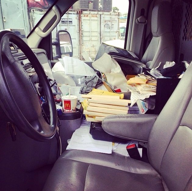 Deze week geen foto van Karel zijn ‘vakwerk’ maar twee keer zijn bus in beeld. Als installateur wil je toch een beetje goed voor de dag komen. Zo zorg je ervoor dat je bus af en toe eens door de wasstraat wordt gereden, ruim je hem bij tijd en wijlen even op en neem je veiligheid en arbo-regels in acht. Karel is niet zo van het opruimen, zo kun je op de eerste foto duidelijk zien. De meeste zelfstandigen hebben een kantoor aan huis, maar Karel heeft aan de term flexibele werkplek een geheel nieuwe dimensie gegeven. Zijn complete administratie past namelijk perfect op de bijrijdersstoel. Voor zijn dagelijkse lunch van de firma met de gele M blijft zelfs nog voldoende ruimte over. Zo heeft Karel alles lekker bij de hand en kan hij tijdens zijn lunch nog wat factuurtjes versturen.