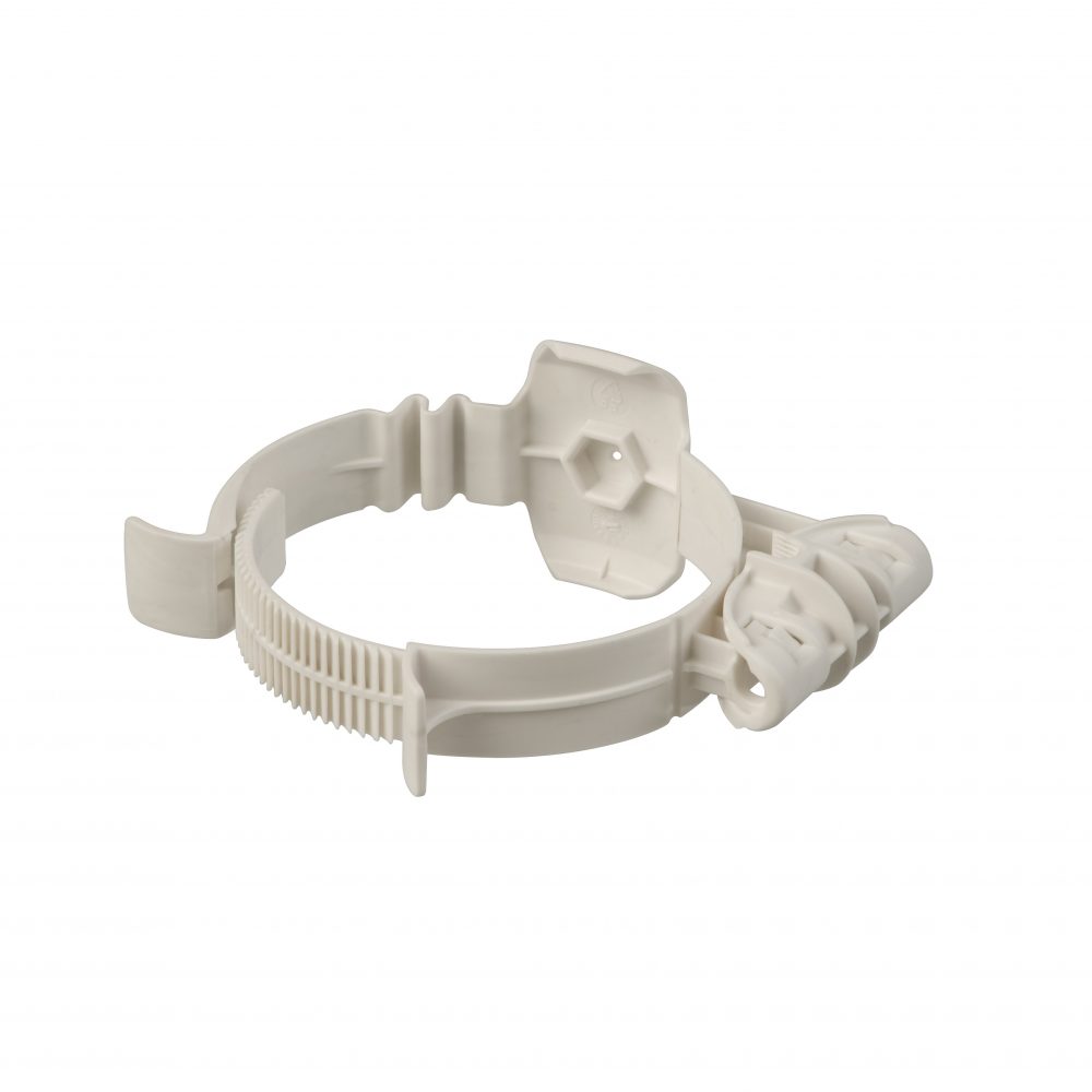 Dankzij het unieke ontwerp van de nieuwe kunststof Beugel 80-100 Click PP wit, bevestigt u het hele rookgasafvoersysteem veilig en snel. Kenmerkend is de eenvoudige montage, zowel horizontaal als verticaal. Door het klembandsysteem (de voorgemonteerde clip) en de inwendige schroefdraadverankering heeft u geen moer meer nodig. Voor de bevestiging kunt u kiezen uit een schroef, draadeind of spijkerplug. Door de fijne tandjes trekt u de beugel moeiteloos aan en fixeert u deze op de gewenste maat. U hoeft niet meer te prutsen achter de rookgasafvoerleiding om af te tekenen en te gokken op de juiste hoogte.