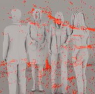 Op de afbeelding: Simulatie van de luchtstroming vanuit de airco en de verspreiding van het coronavirus vanuit patiënt 0 (paars) richting de personen die besmet zijn geraakt (rood). De andere mensen (goudkleur) raakten niet besmet.