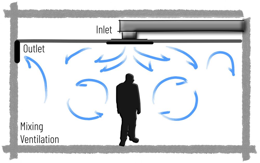 De meeste ventilatiesystemen zijn zo uitgelegd dat er wordt gezorgd voor vermenging van de lucht in de ruimtes. Dit geeft een gelijkmatige temperatuur ter plekke. Helaas zorgt het niet voor een optimale doorspoeling, zodat de schadelijke deeltjes uit de ruimte worden verwijderd.