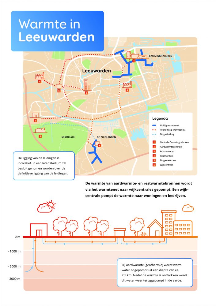 Bij een positief investeringsbesluit eind dit jaar wordt in 2020 de aardwarmtebron geboord en het warmtenetwerk aangelegd. Eind 2021 worden de gebouwen van duurzame warmte voorzien. De komende jaren kan het warmtenet in Leeuwarden snel groeien. Daarmee komt betaalbare, duurzame warmte beschikbaar voor een groot deel van de stad.